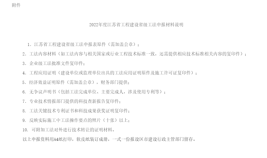 转发:省住房城乡建设厅关于开展2022年度江苏省工程建设省级工法申报工作的通知