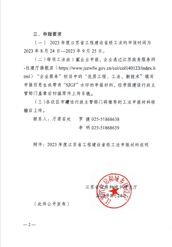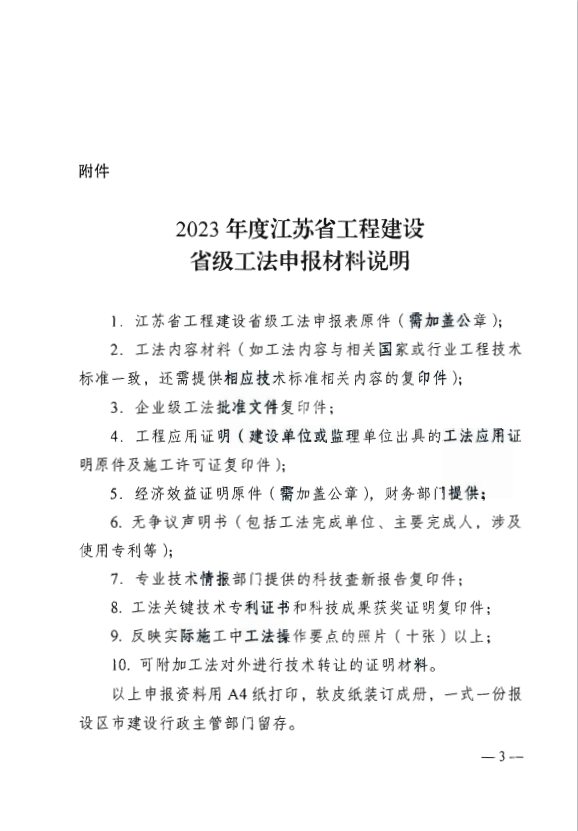 省住房城乡建设厅关于开展2023年度江苏省 工程建设省级工法申报工作的通知