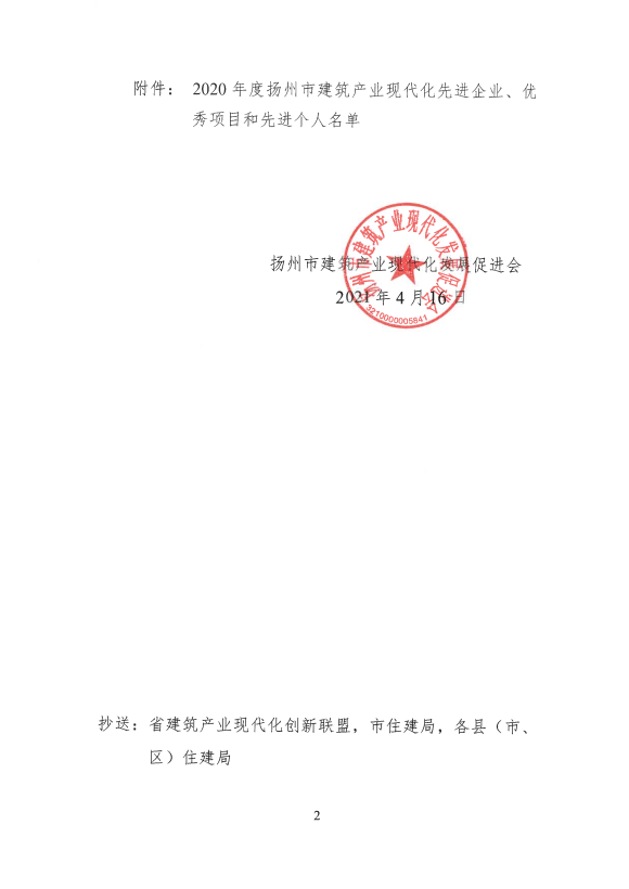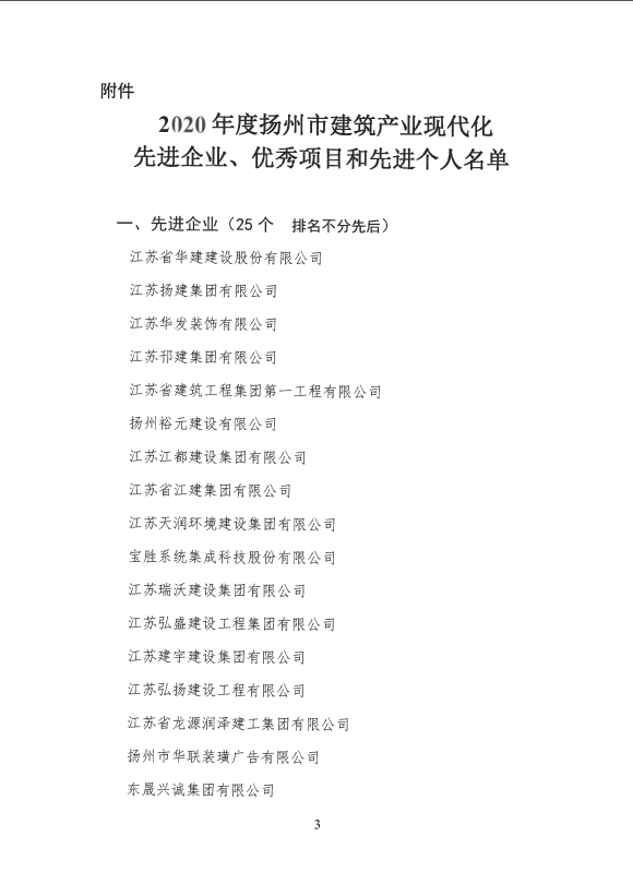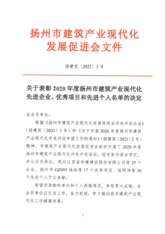 关于表彰2020年度扬州市建筑产业现代化先进企业、优秀项目和先进个人名单的决定