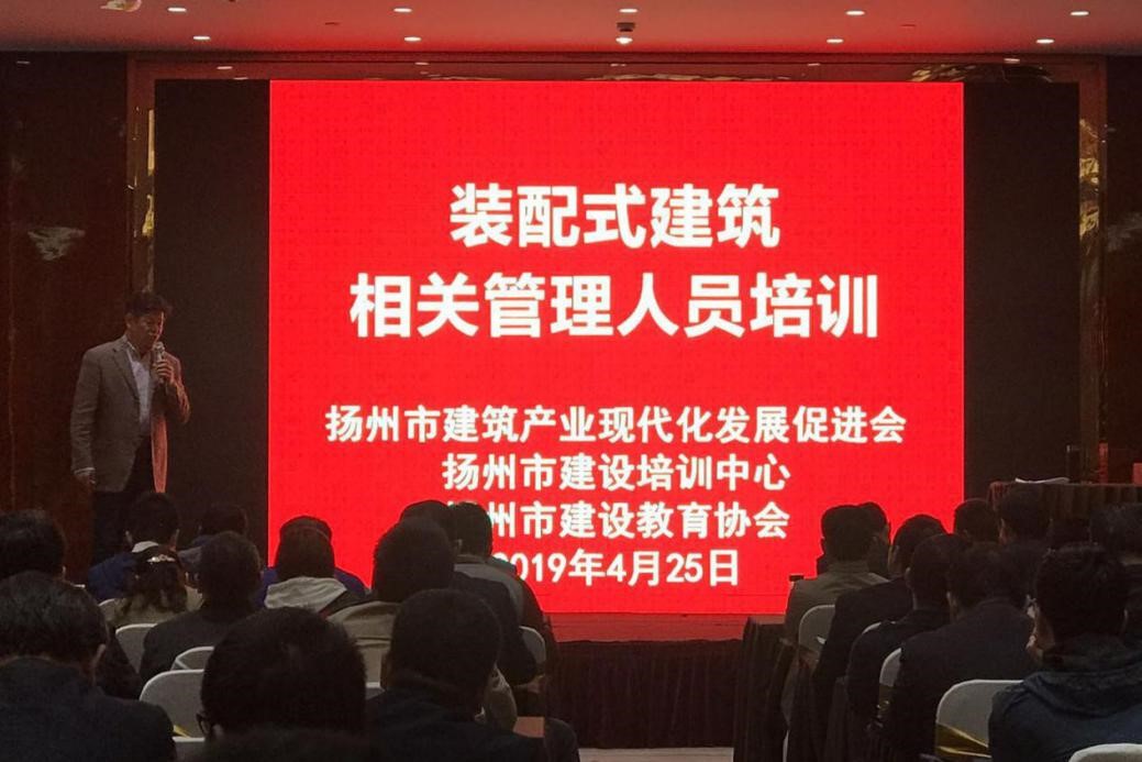 培训分理论授课和现场观摩两个环节。上午,理论课在扬鹏锦江大酒店举行,邀请了扬州市职业大学蒋业浩副教授和南京易和佳BIM工程项目管理有限公司单毅总经理分别对装配式建筑相关基础知识和BlM在装配式建筑中的全过程应用进行了详细讲解。
