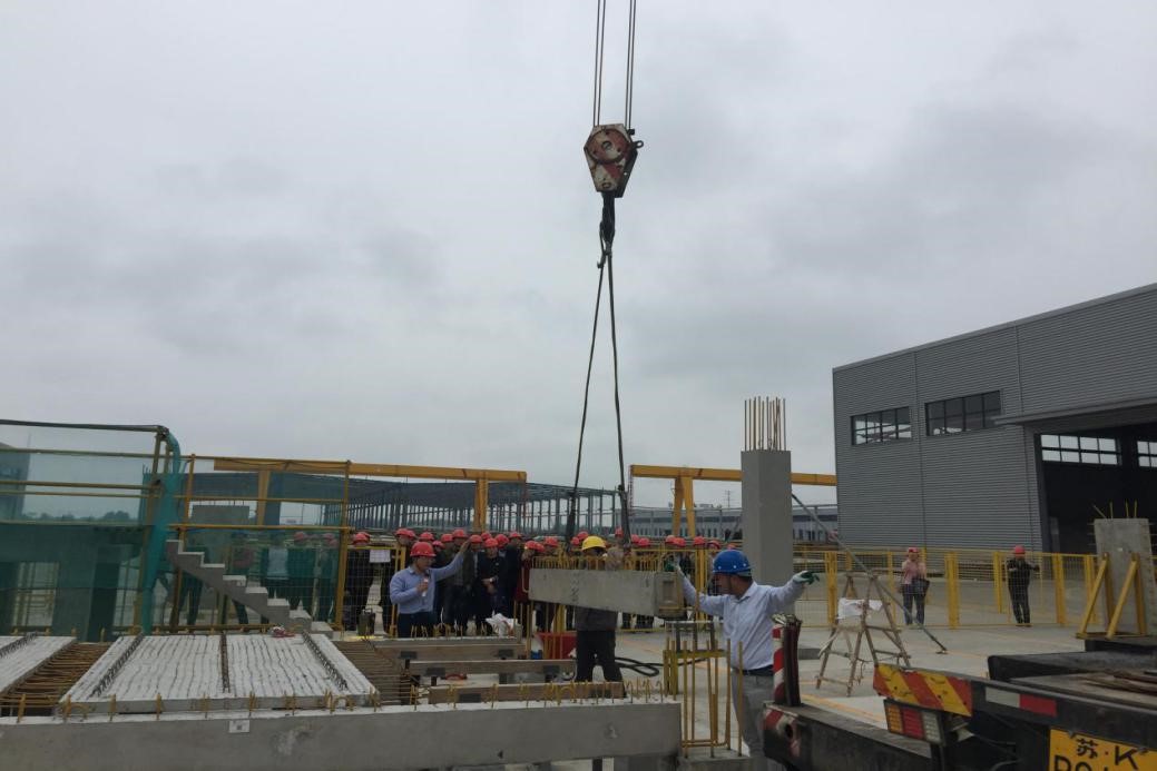 下午,参会人员集中乘车来到江苏和天下节能科技股份有限公司,在该公司相关负责人的带领下现场参观装配式建筑构件生产厂区和装配式建筑人才实训基地,现场观摩了预制墙板、梁和叠合板的吊装,以及灌浆等构件安装的实训过程。