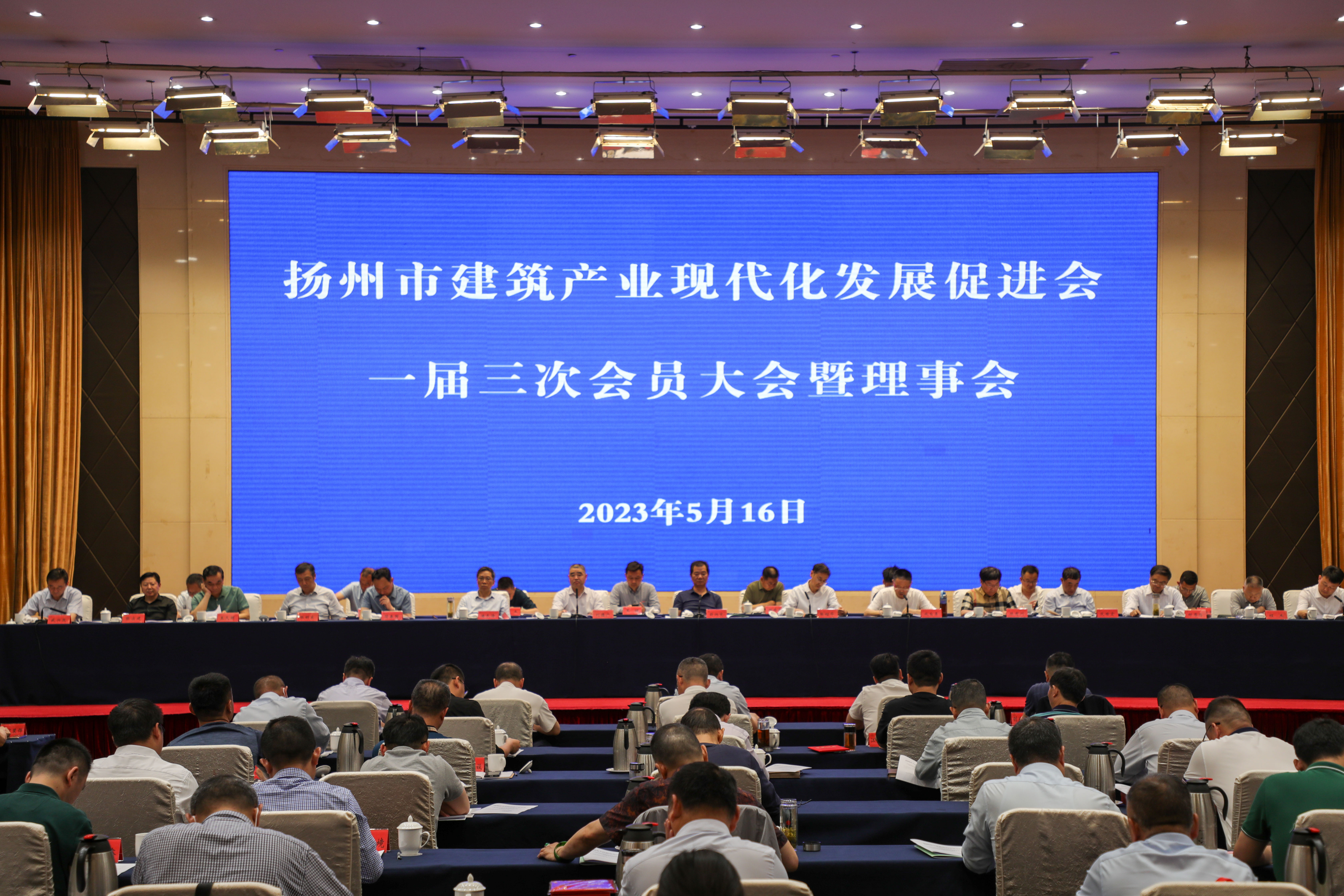 市促进会办公室(赵正香、郭 护/文 梁明建/摄) 5月16日上午,市建筑产业现代化发展促进会一届三次会员大会暨理事会在扬州顺利召开。会议由促进会党建指导员刘德广主持,市住房和城乡建设局二级调研员薛炳宽、市社会组织管理局局长张绍华出席会议并作重要讲话。会员单位代表、个人会员、相关职能部门共140余人参加会议。