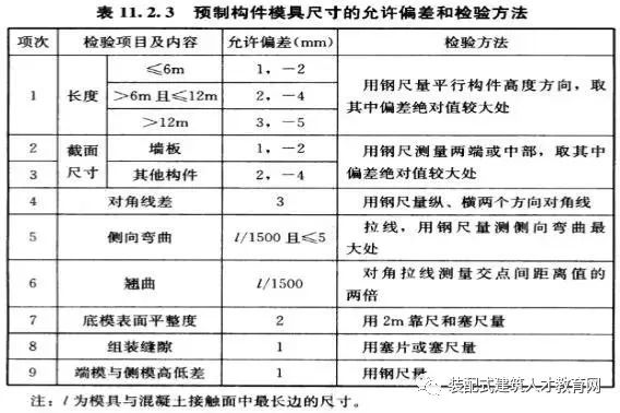 1)模具设计完成后,一般由专业的模具加工厂家进行加工制作、表面涂装后运往PC构件生产厂家。模具进场后根据设计图对模具进行验收,钢材表面是否生锈,钢板材质是否符合要求,模具尺寸、平整度、拼缝等,验收方法和标准详见上表11.2.3表。