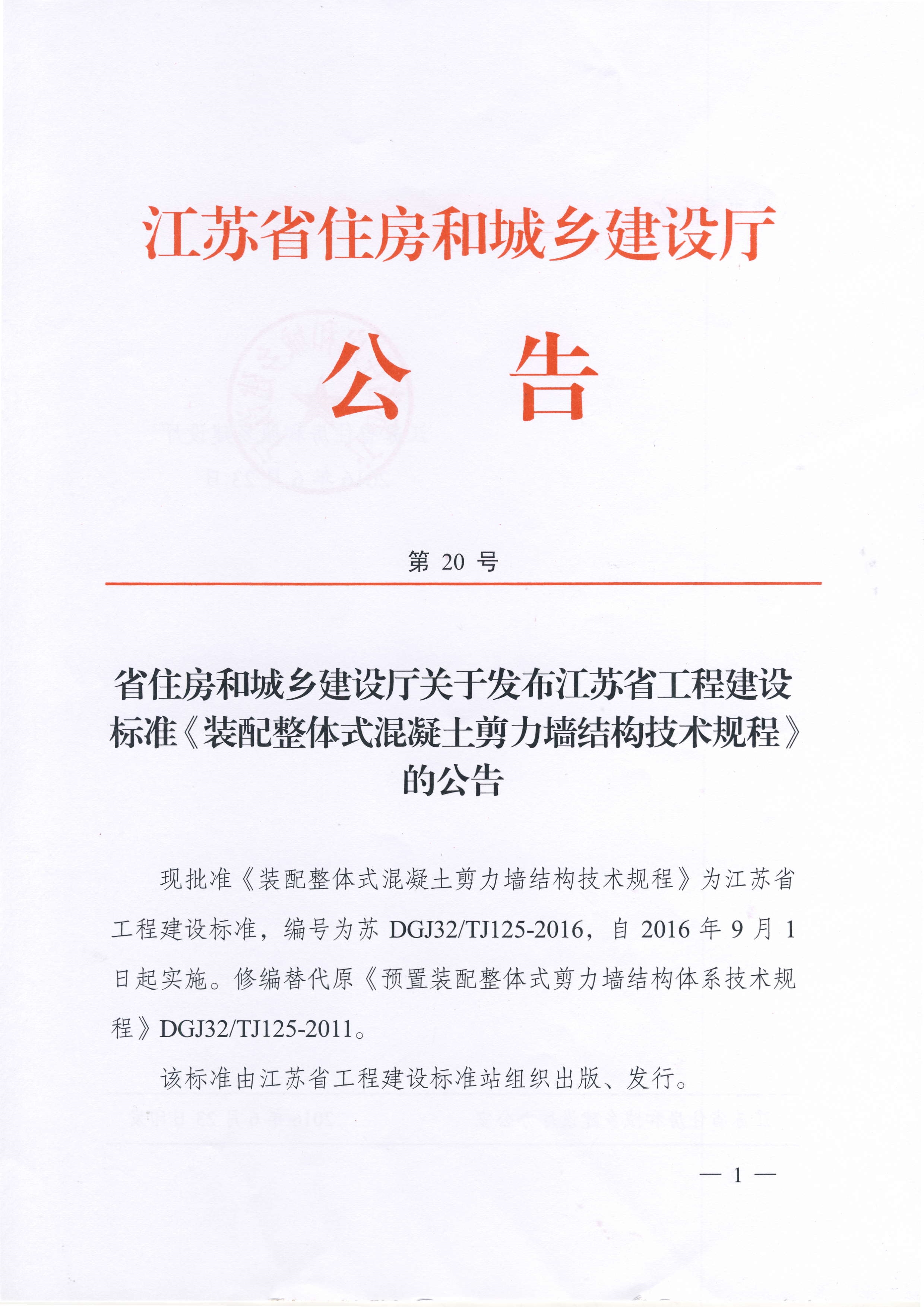 省住房和城乡建设厅关于发布江苏省工程建设标准《装配整体式混凝土剪力墙结构技术规程》的公告
