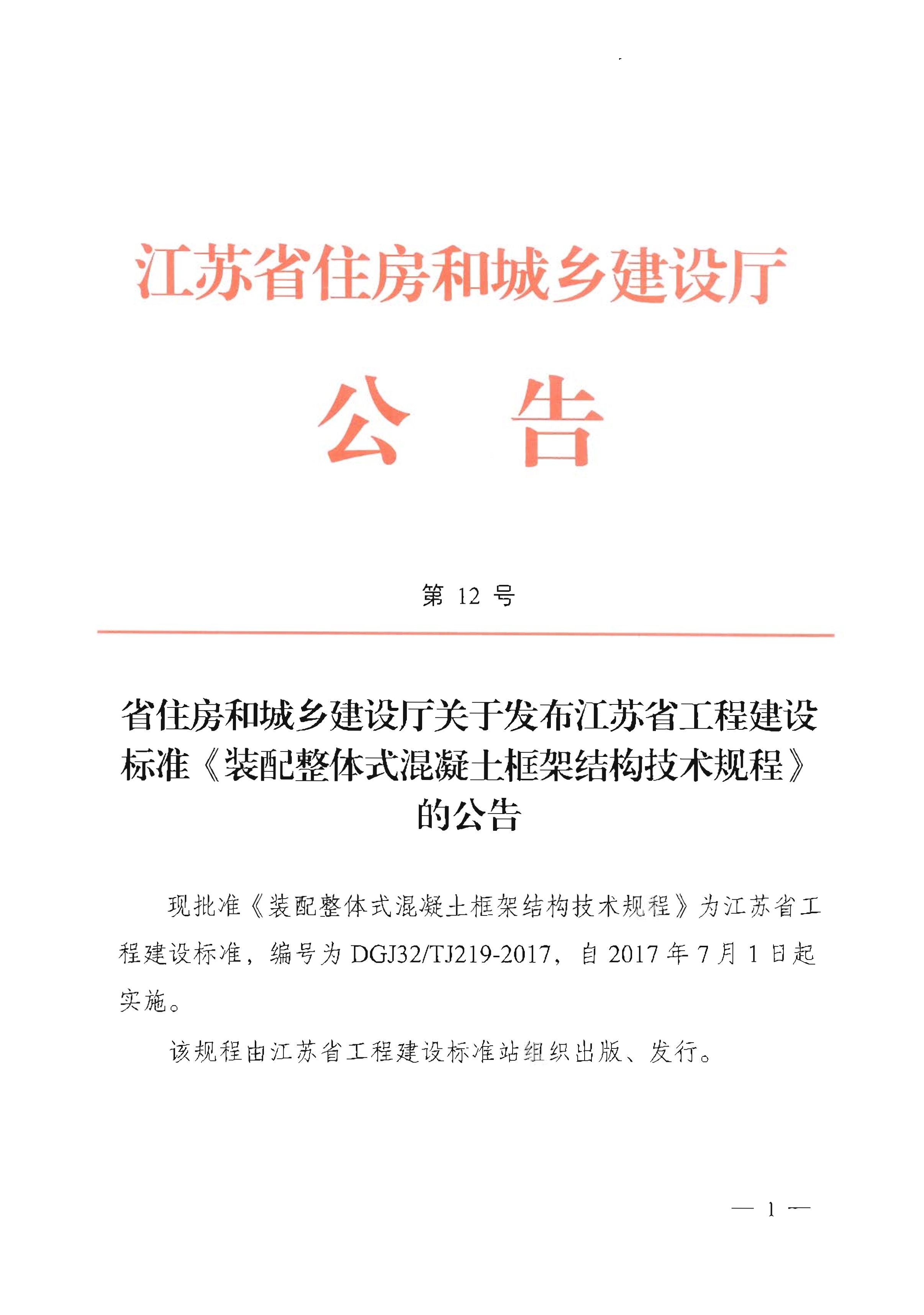 省住房和城乡建设厅关于发布江苏省工程建设标准《装配整体式混凝土框架结构技术规程》的公告